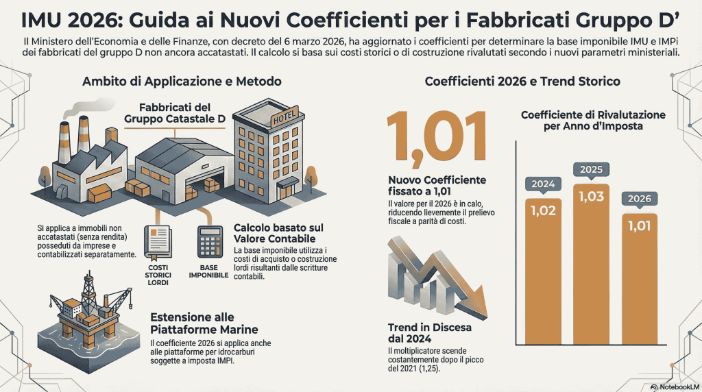 Anche per queste piattaforme, quando non esiste un valore catastale attribuito, il calcolo della base imponibile avviene utilizzando i costi storici aggiornati con i coefficienti stabiliti annualmente dal decreto ministeriale.