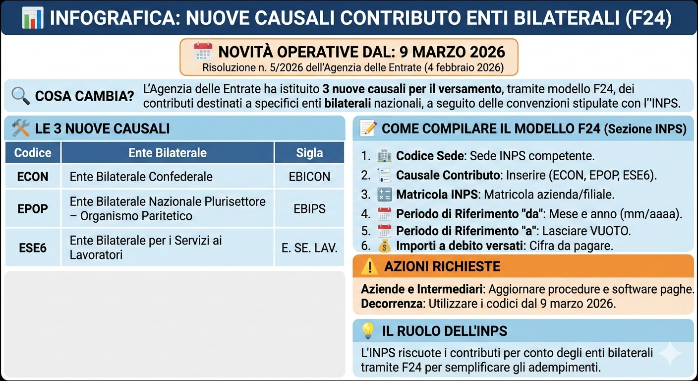 In data 4 febbraio 2026, con la Risoluzione n. 5/2026, l’Agenzia delle Entrate ha istituito tre nuove causali contributo destinate al versamento, tramite modello F24, dei contributi dovuti a specifici enti bilaterali nazionali.
