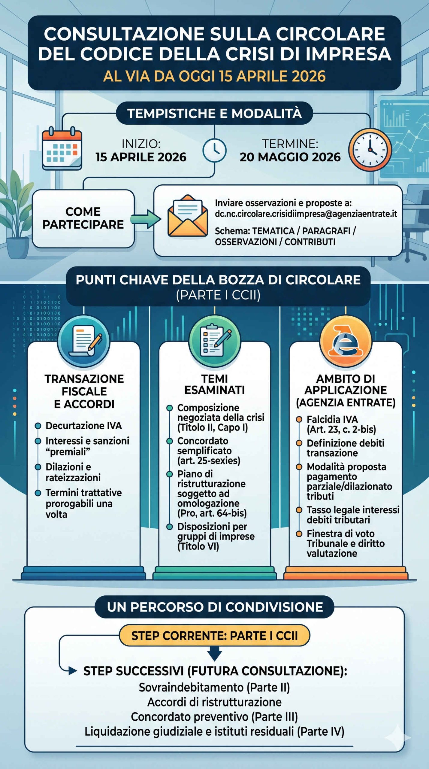 Dal 15 aprile 2026 è ufficialmente aperta la consultazione pubblica promossa dall’Agenzia delle Entrate sulla bozza di circolare relativa alla Parte I del Codice della crisi d’impresa e dell’insolvenza (CCII, Dlgs n. 14/2019).