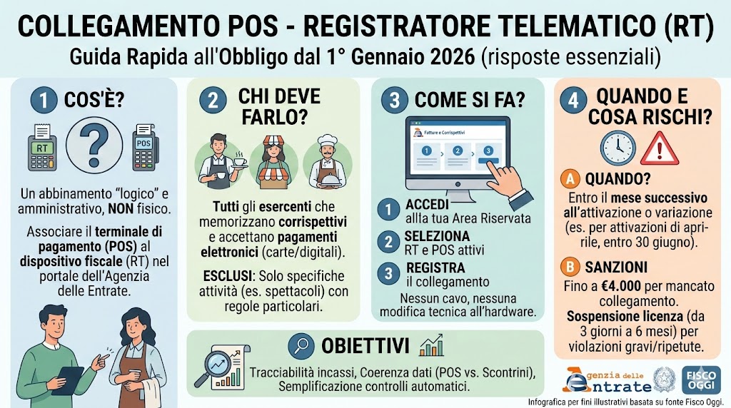 Con la Risposta n. 44 del 20 febbraio 2026, l’Agenzia delle Entrate fornisce un importante chiarimento interpretativo sull’obbligo di collegamento tra strumenti di pagamento elettronico (POS) e registratori telematici (RT), introdotto dalla Legge di Bilancio 2025.