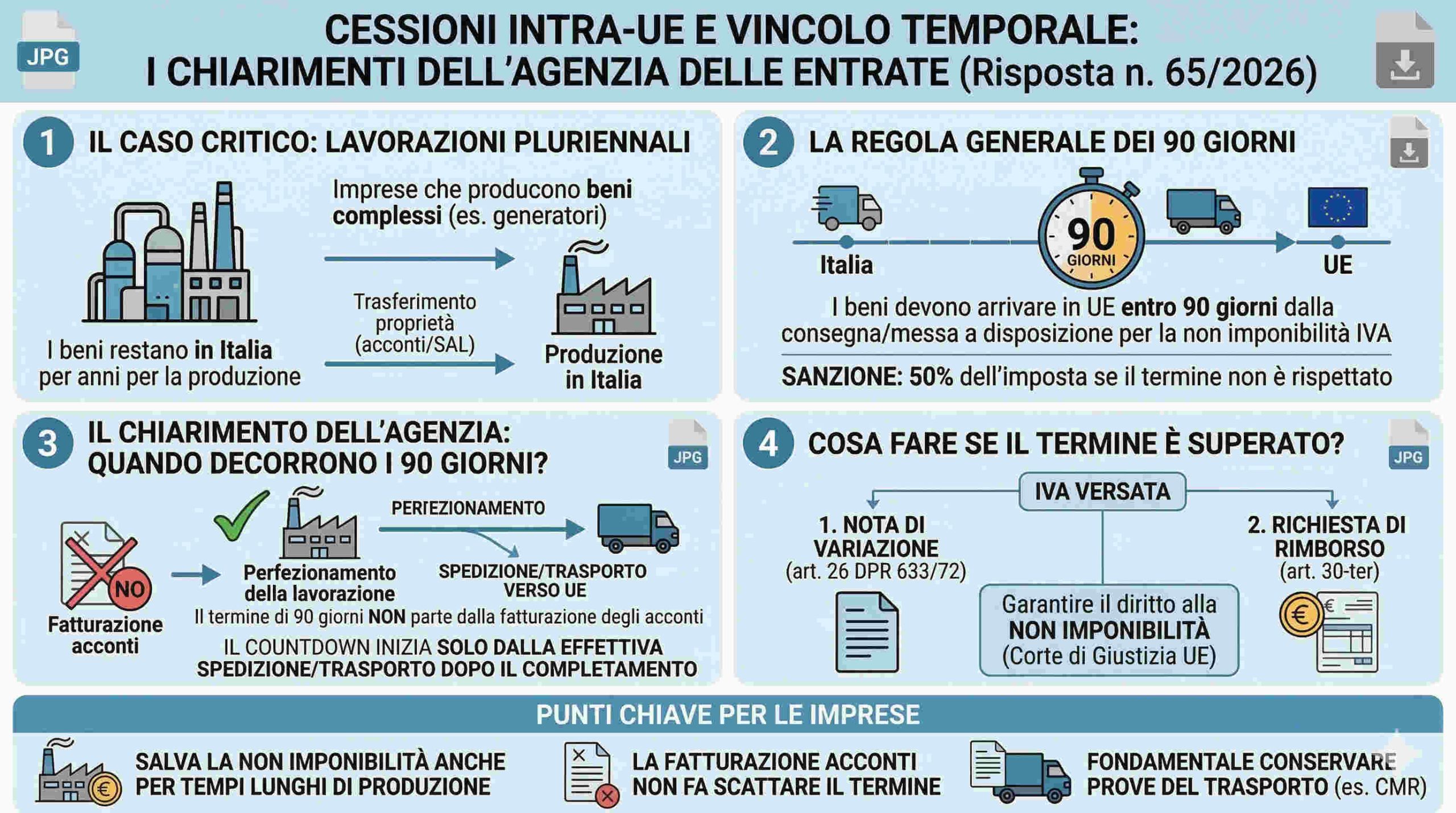 Con la risposta n. 65 del 4 marzo 2026, l’Agenzia delle Entrate ha fornito importanti chiarimenti riguardo al regime delle cessioni intracomunitarie di beni, con particolare attenzione al nuovo vincolo temporale introdotto dal decreto legislativo n. 87 del 2024. Il tema riguarda soprattutto i casi più complessi, come quelli in cui i beni oggetto di vendita sono il risultato di lavorazioni lunghe e articolate e si fatturano progressivamente prima della consegna finale.