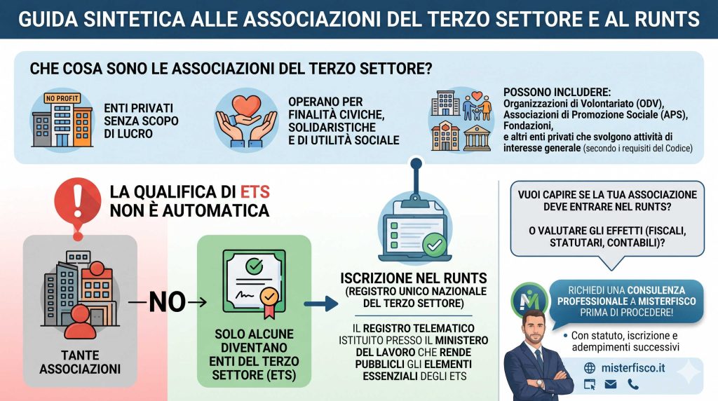 Per maggiori informazioni su associazioni del Terzo Settore e RUNTS richiedi una consulenza professionale personalizzata a Misterfisco.