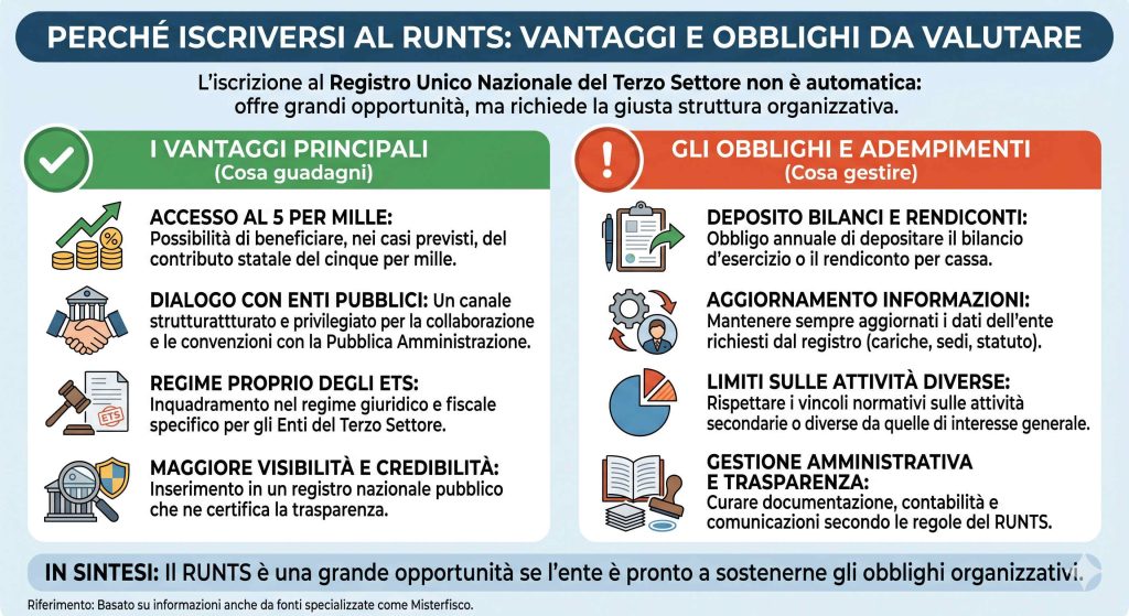 Come evidenzia anche la pagina di Misterfisco dedicata al tema, l’iscrizione al RUNTS non è una scelta da prendere in automatico: può offrire vantaggi, ma comporta anche adempimenti amministrativi, civilistici, contabili e fiscali. Tra i benefici più rilevanti ci sono la possibilità di accedere, nei casi previsti, al 5 per mille, un dialogo più strutturato con enti pubblici e locali e l’inquadramento nel regime proprio degli ETS.
