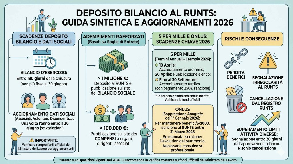 Di solito il più sottovalutato è la corretta gestione di bilanci, rendiconti e aggiornamento dati nel RUNTS, insieme al controllo delle attività diverse. Dal 2026 il deposito del bilancio segue il termine dei 180 giorni dalla chiusura dell’esercizio, ma va sempre verificata la disciplina aggiornata.