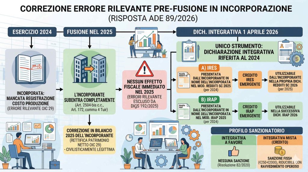 La correzione di un errore contabile commesso prima di una fusione può essere perfettamente valida sotto il profilo civilistico, ma questo non implica automaticamente un riconoscimento immediato anche sul piano fiscale. È proprio questo il punto centrale chiarito dall’Agenzia delle entrate nella risposta n. 89 del 31 marzo 2026: quando l’errore è qualificato come “rilevante”, gli effetti tributari non possono emergere nel bilancio in cui viene corretto, ma devono essere ricondotti all’esercizio originario tramite dichiarazione integrativa.