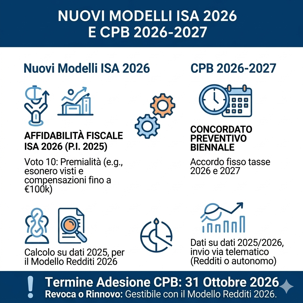 L’Agenzia delle entrate ha reso disponibili i nuovi modelli relativi alla comunicazione dei dati necessari per l’applicazione degli ISA (Indici sintetici di affidabilità fiscale) per il periodo d’imposta 2026 e il modello per il calcolo e l’adesione al Concordato preventivo biennale (CPB) relativo agli anni 2026 e 2027.