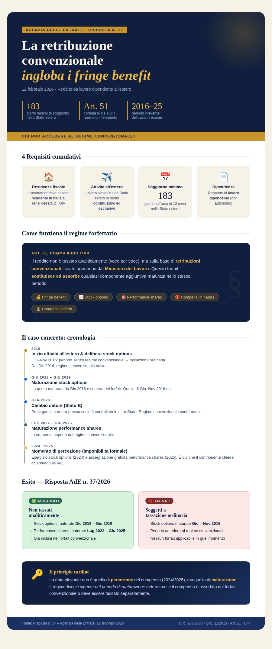 Tuttavia, il comma 8-bis dello stesso articolo introduce una deroga: per i lavoratori che operano stabilmente all’estero per oltre 183 giorni, il reddito viene determinato sulla base delle retribuzioni convenzionali, sostituendo la tassazione analitica.