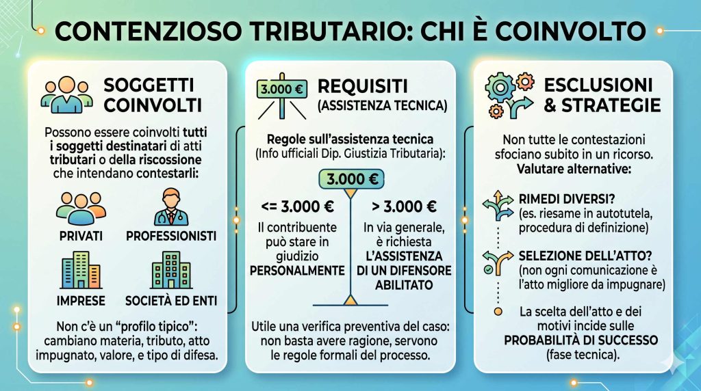 Nel contenzioso tributario possono essere coinvolti privati, professionisti, imprese, società ed enti, cioè tutti i soggetti destinatari di atti tributari o della riscossione che intendano contestarli. Non esiste quindi un solo “profilo tipico”: cambiano la materia, il tributo, l’atto impugnato, il valore della controversia e il tipo di difesa da impostare.