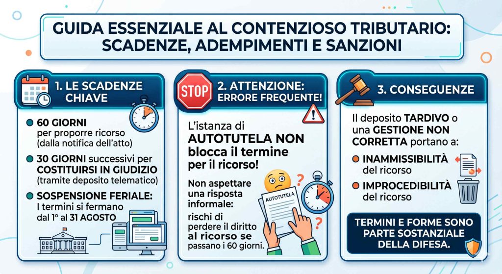 Quanto alle conseguenze, il deposito tardivo o una gestione processuale non corretta possono portare a inammissibilità o improcedibilità del ricorso. Anche per questo non conviene affrontare il contenzioso tributario come un semplice adempimento burocratico: i termini e le forme sono parte sostanziale della difesa.