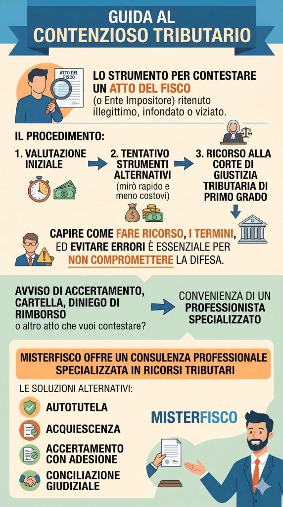 Il contenzioso tributario è lo strumento con cui il contribuente può contestare un atto del Fisco o dell’ente impositore quando lo ritiene illegittimo, infondato o viziato. In pratica, si apre un procedimento davanti alla Corte di giustizia tributaria di primo grado, dopo avere valutato se esistono soluzioni alternative più rapide o meno costose. Capire come fare ricorso, quali sono i termini e quali errori evitare è essenziale: un passaggio sbagliato può compromettere la difesa. Vediamo insieme come muoversi in concreto e quando conviene farsi assistere da un professionista specializzato.