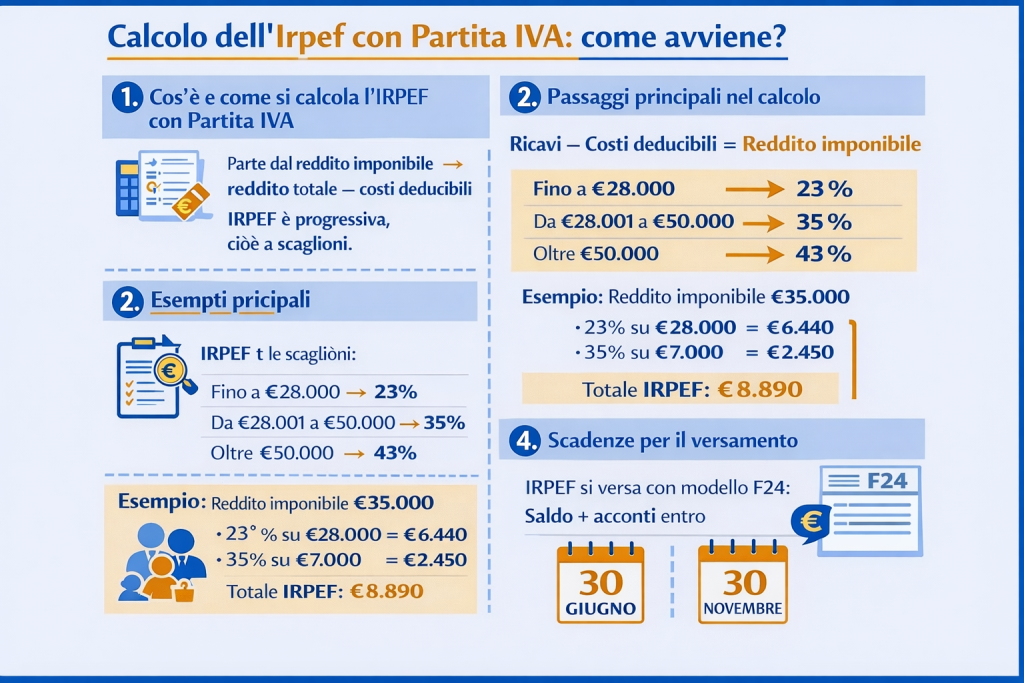 Avviare un’attività di lavoro autonomo – come libero professionista o titolare di ditta individuale – comporta diversi obblighi fiscali, tra cui il calcolo e il versamento dell’IRPEF (Imposta sul Reddito delle Persone Fisiche). Comprendere come funziona questo meccanismo è fondamentale per gestire correttamente la propria attività e ottimizzare il carico fiscale. Scopriamo in questa fiscale come avviene il calcolo dell’Irpef con Partita IVA. Per chi avvia un’attività autonoma, comprendere il funzionamento dell’IRPEF non è solo un obbligo, ma uno strumento di gestione strategica.