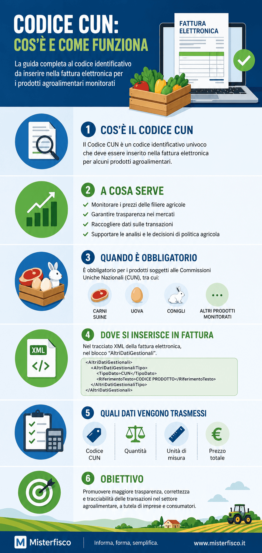 Il Codice CUN è un Codice Univoco Nazionale da inserire nel tracciato xml della fattura elettronica per quei prodotti soggetti al controllo della Commissione unica nazionale. La Commissione Unica Nazionale è un organo a livello nazionale che si occupa dei prezzi e della trasparenza contrattuale dei prodotti agroalimentari.