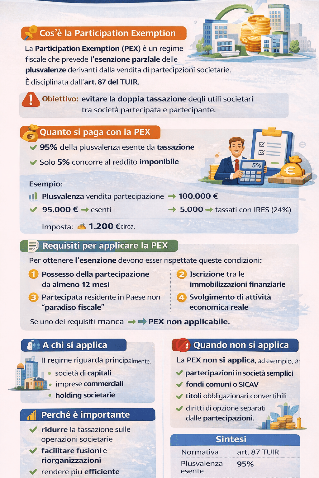 Ai sensi dell’art. 87 TUIR, le plusvalenze realizzate da società di capitali e da enti commerciali residenti mediante la cessione di partecipazioni sono esenti da imposizione nella misura del 95%, a condizione che ricorrano determinati requisiti.