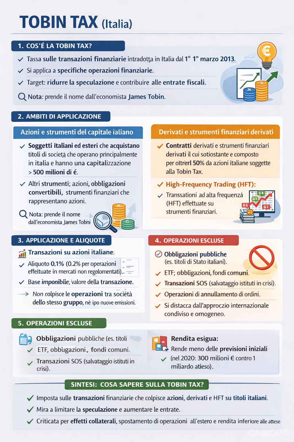 L’imposta sulle transazioni finanziarie, o tobin tax, è una tassa che si paga sulle operazioni che hanno per oggetto le azioni e gli altri strumenti finanziari di società italiane con sede in Italia con una capitalizzazione superiore a 500 milioni di euro. Queste riguardano: