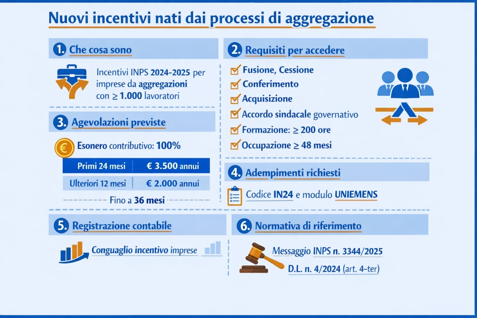 L’INPS, per il biennio 2024-2025 ha introdotto, in via sperimentale, degli incentivi per le imprese che sono nate con dei processi di aggregazione (quali fusioni, cessioni o acquisizioni) e che abbiano almeno 1000 lavoratori.