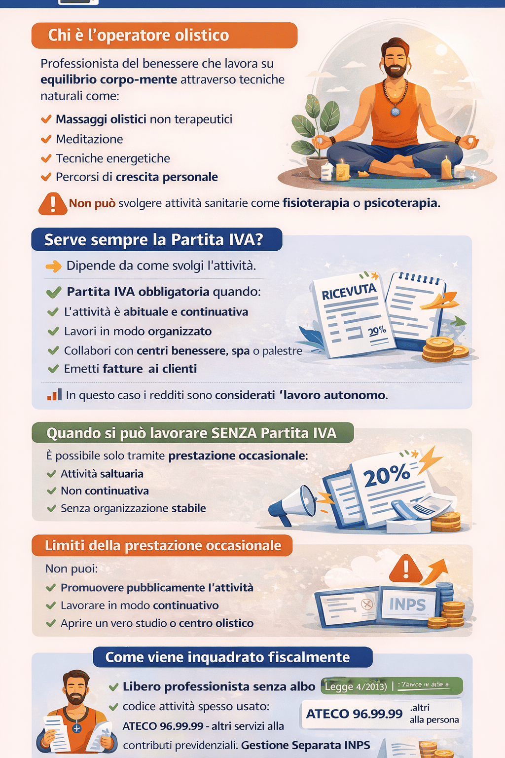 Si precisa, inoltre, che l’apertura della partita IVA da parte di un operatore olistico non comporta l’assunzione dello status di professionista sanitario. L’attività si configura, infatti, come prestazione di servizi alla persona nell’ambito del benessere, caratterizzata da natura non sanitaria e non regolamentata, purché non vengano svolte attività riservate alle professioni sanitarie riconosciute dall’ordinamento vigente.