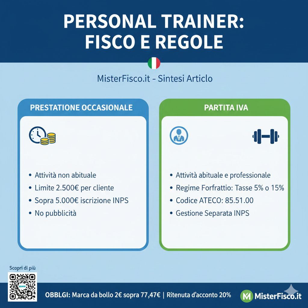 Se l’attività di Personal Trainer presenta la caratteristica di abitualità e di professionalità è necessario aprire Partita IVA. Se si opta per il Regime Forfettario, le tasse da versare al Fisco sono solo il 5 percento (per i primi 5 anni di attività) ed il 15 percento dal sesto anno in poi, in sostituzione delle più elevate percentuali dell’Irpef. L’apertura della Partita IVA ti consentirà di incrementare il giro di affari e di farti pubblicità, raggiungendo sempre più clienti.